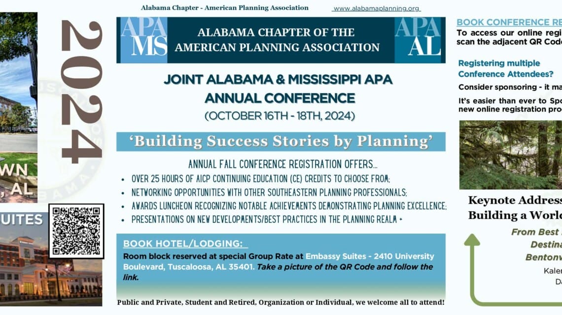 The Alabama Chapter of the American Planning Association, through its Annual Awards Program, seeks to recognize the notable contributions and achievements of planning professionals, elected or lay persons, the media and our state planning students. Additionally, the chapter seeks to recognize outstanding planning programs, plans and projects prepared and implemented by local governments, private consultants, as well as other local organizations and agencies throughout the state.